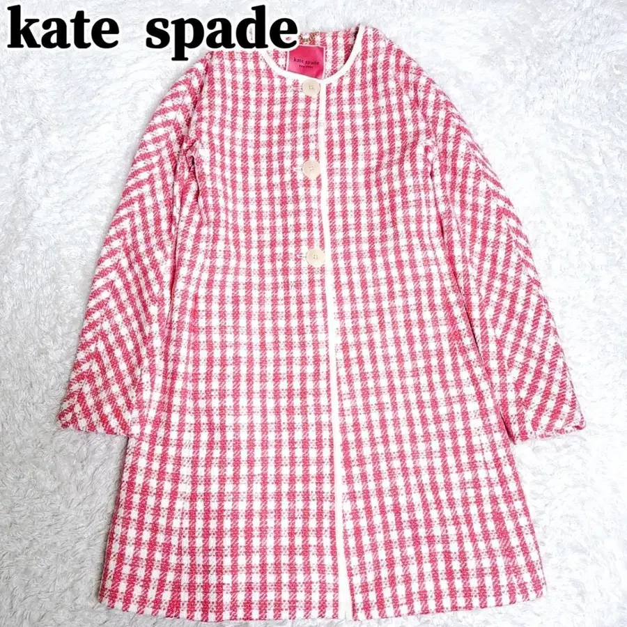 노카라 코트 트위드 코트 체크 무늬 깅엄 체크 핑크 코트 여성용 코트 롱 코트 A라인 고급 코디 페미닌 포멀 코디 봄/가을 코트 XS 사이즈 브랜드 아우터 Kate Spade New York Tweed coat Elegant style