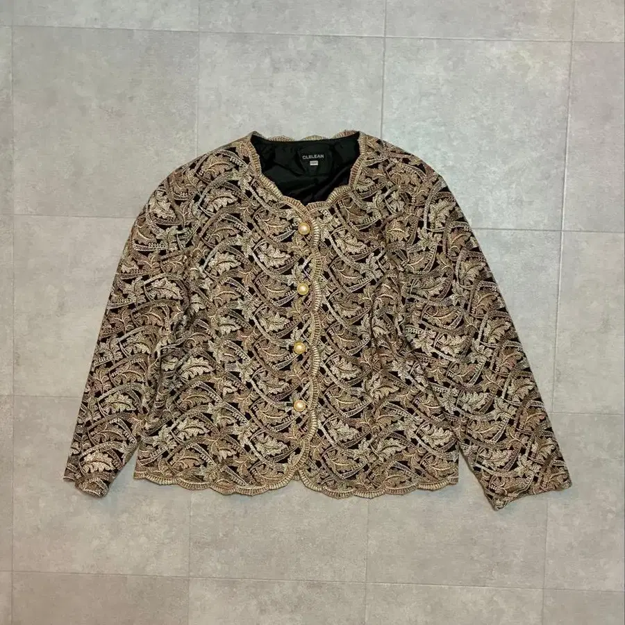 골드 계열의 실을 사용한 입체적인 자수 디자인이 특징이며, 걸치기만 해도 스타일을 격상시켜 줍니다.