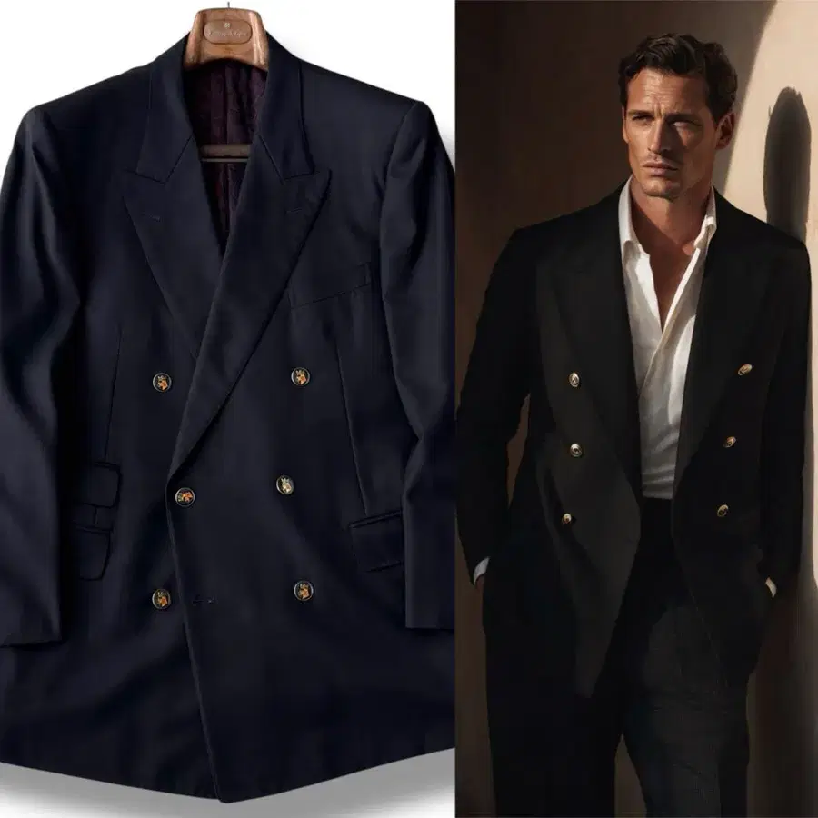 더블 브레스트 특유의 단정한 표정에 적당히 구축된 실루엣.