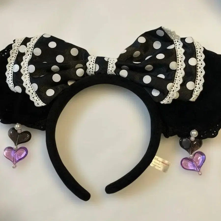 TDR 디즈니 미니 머리띠 블랙 도트 리본 하트 귀찌 레이스