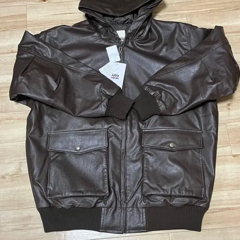 [ 자바 콜라보 ] 인조 가죽 후디 블루종 브라운