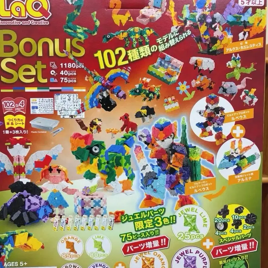 LaQ 라큐 보너스 세트 2025 1180피스에 더해, 주얼 파츠 한정 3색이 75피스, 스페셜 파츠가 20피스, 10피스, 4피스, 2피스씩 증량되었습니다. 대상 연령은 5세 이상이며, 102가지 모델로 재조합 가능합니다. 만들기 책과 시트가 1권+3장 부속되어 있으며, 플라스틱 컨테이너도 포함되어 있습니다. 미개봉품이므로, 새상품급 상태로 즐기실 수 있습니다. [ 브랜드 ] LaQ [ 카테고리 ] 블록 [ 상품 상태 ] 미사용 [ 색상 ] 멀티 컬러 [ 피스 수 ] 1180pcs + 주얼 파츠 75pcs + 스페셜 파츠 36pcs [ 대상 연령 ] 5세 이상 잘 부탁드립니다.