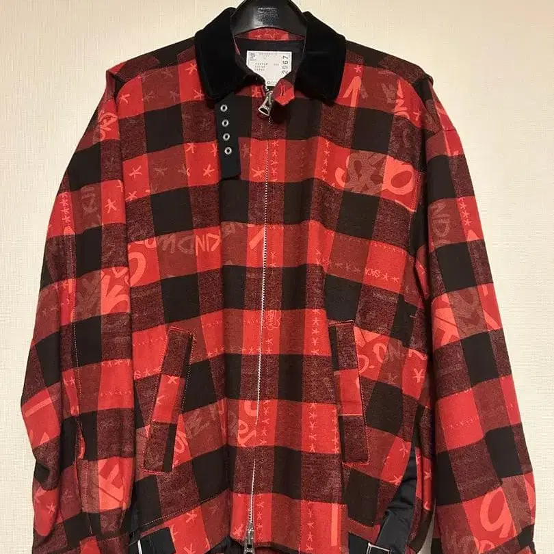 빨간색 x 블랙 체크 무늬를 베이스로, Eric Haze의 그래픽을 전체적으로 담아낸 디자인으로, sacai다운 재해석의 아름다움과 아트성이 융합된 한 벌입니다.