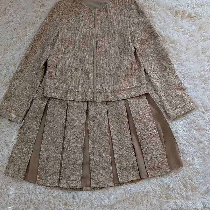 베이지 트위드 셋업, 집업 자켓과 플리츠 스커트. K.T (KIYOKO TAKASE)