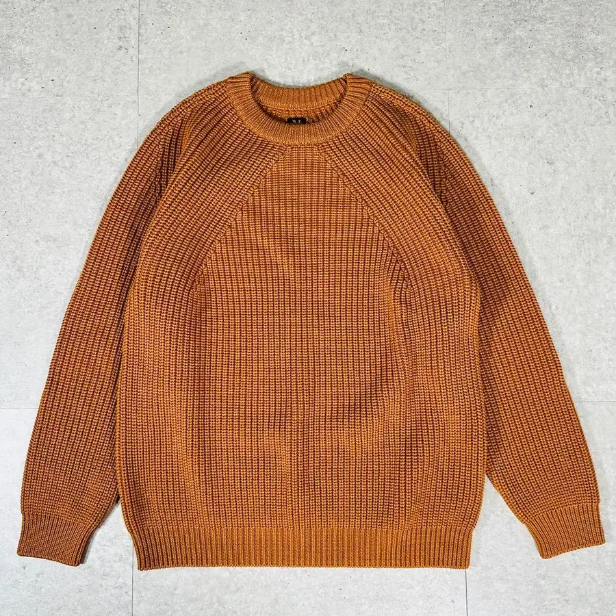 독자적인 방법으로 일부러 굵은 실로 편직하여, 꽈배기 짜임의 표정이 아름답게 나오도록 완성한 크루넥 니트.