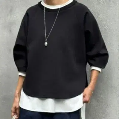약간 짧은 기장이지만 밑단이 라운드 컷으로 되어 있어 레이어드하기 쉬운 디자인입니다.