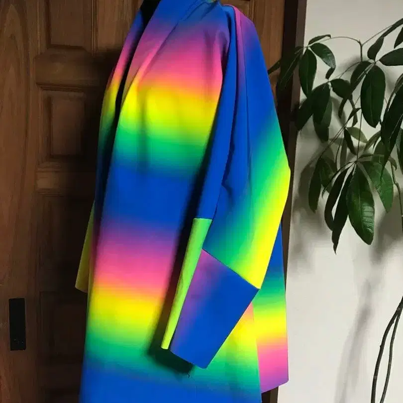 봐주셔서 감사합니다. 이번에는 추운 겨울에 입을 수 있는 자켓을 만들었습니다. 세련된 고급 원단의 자켓을 걸치면 등줄기가 펴지고 시원하게 걸을 수 있습니다. 대담하고 선명한 레인보우 패턴입니다. 개성 있는 의류를 좋아하시는 분께 잘 어울립니다. 스키웨어 원단으로 안감은 없습니다. 신축성 있는 원단이라 L L 사이즈이신 분도 괜찮을 수 있습니다. 유명 브랜드 원단입니다. 구찌입니다. 옷깃이 기모노처럼 넓어서 세워도, 접어도 입을 수 있습니다. 입으면 목둘레를 덮어주기 때문에 목도리 없이도 괜찮습니다. 가슴 폭 106, 기장 97cm 정도입니다. 레이어드할 수 있도록 L 사이즈로 만들었습니다. 캐주얼하지 않은 겉옷이 됩니다. 앞은 브로치로 여미는 코디도 가능합니다. 팬츠, 스커트에도 어울리는 길이입니다. 또한, 신경 쓰이는 허리 둘레를 커버할 수 있습니다. 동일 원단으로 넥워머 후드를 만들었습니다. 후드도 함께 착용하면 마치 스키웨어 같습니다. 따뜻하게 입을 수 있습니다. 소매 부분은 원단 폭이 부족하여 이어 붙였습니다. 취미로 작품을 만들고 있으므로, 이를 이해해주시고 구매를 잘 부탁드립니다. 기장 - 미들 소재 - 화학 섬유 계절감 - 가을, 겨울