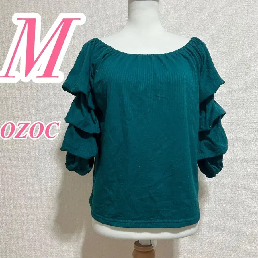 자동 번역되었어요. 원문보기그린 색상의 오프숄더, 프릴 디자인의 블라우스.