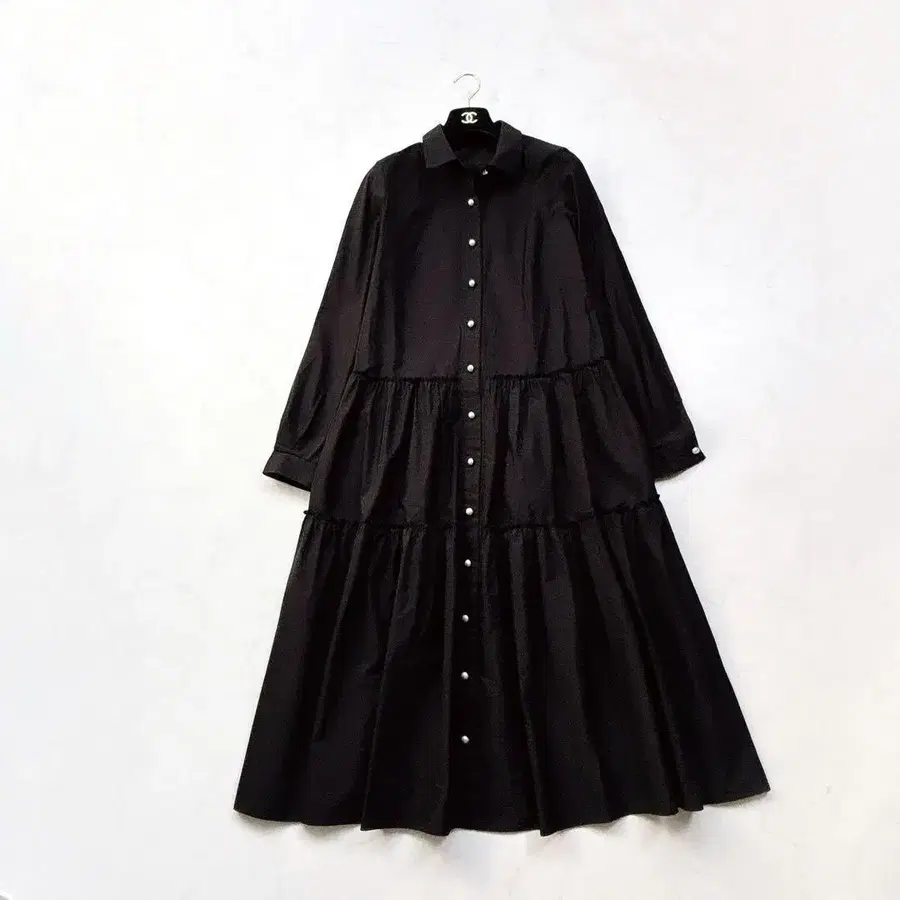 [ Rene ] 티어드 셔츠 드레스 원피스 펄 버튼 실크 혼방 블랙 40