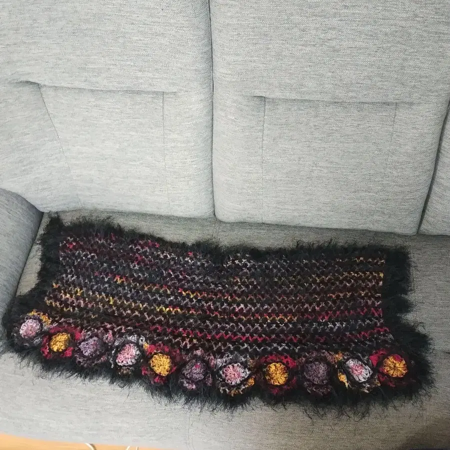 어머니께서는 꽃 모티브 11개는 단염사로 크로셰 뜨개질로 만들었고, 꽃 모티브 위로는 컬러풀한 단염사와 블랙의 다른 실을 번갈아 크로셰 뜨개질했다고 말씀하셨습니다.
