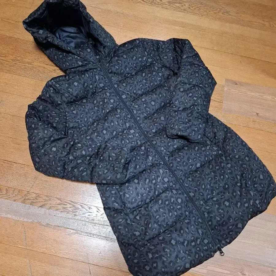 유니클로 후드 부착 블랙 레오파드 무늬 다운 자켓