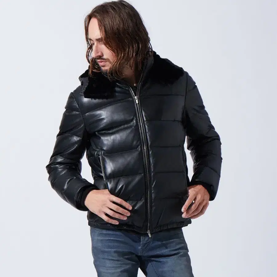 스타일리시한 블랙 다운 자켓, 탈부착 가능한 후드 부착.