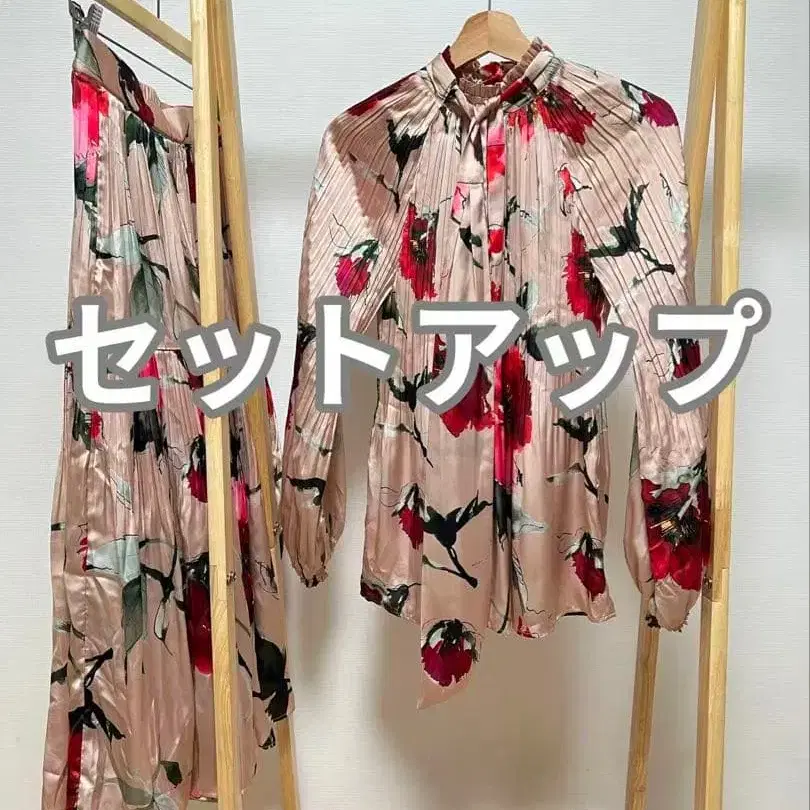 Sov. 플라워 새틴 보타이 블라우스 셋업