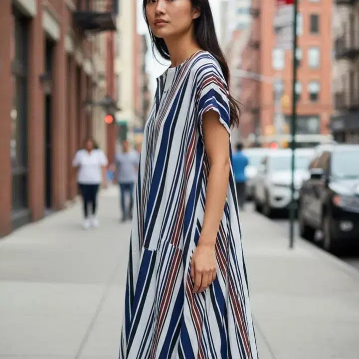 새상품 아츠로우 타야마 F 스트라이프 반팔 셔츠 원피스 롱 파랑 화이트