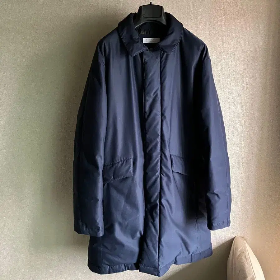 색상은 차분한 네이비이며, 형태는 스텐카라 코트 (발마칸 코트)와 유사합니다.