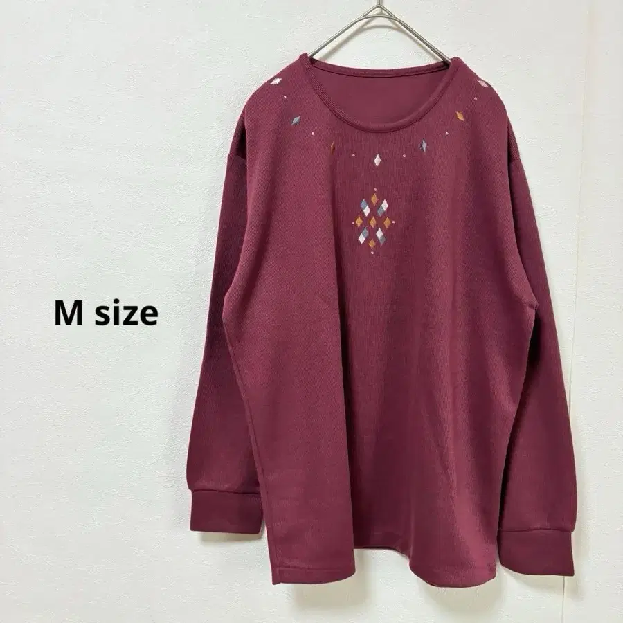 긴팔 티셔츠 M 버건디 마름모 자수 크루넥 일본제