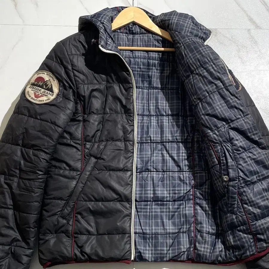 자동 번역되었어요. 원문보기ARMANI EXCHANGE 알마니 익스체인지 충전솜 다운 자켓 XL 블랙 검정 파이핑 레드 와펜 빅 로고 리버서블 체크