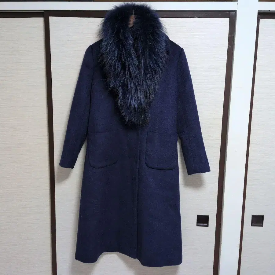 [미사용] 퍼 탈부착 가능 2way 퍼 포함 롱 코트 울 네이비