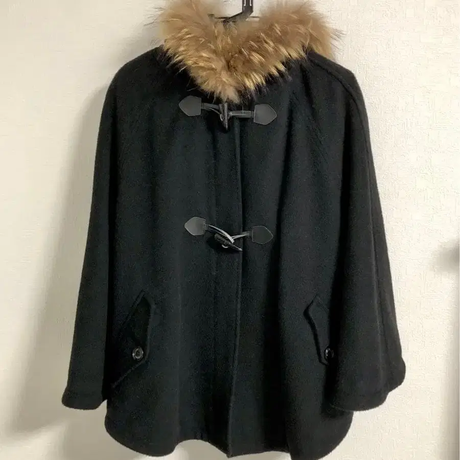MARY QUANT 퍼 달린 블랙 판초 케이프 코트