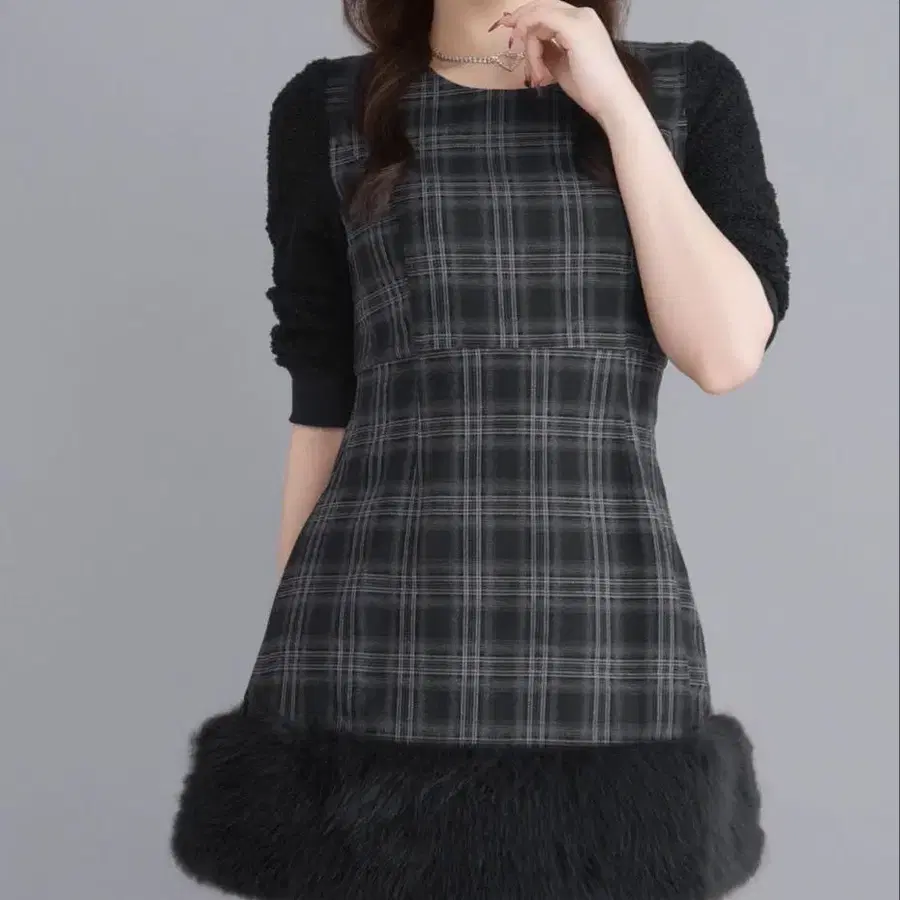체크 무늬 포인트 퍼(fur) 포함 미니 원피스