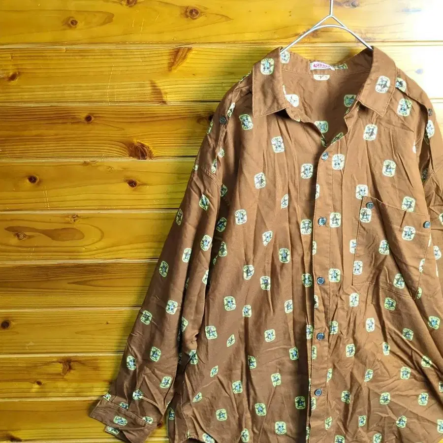 올 패턴 풍경 무늬 긴팔 셔츠 브라운 그린 일본제 빈티지 프리 사이즈