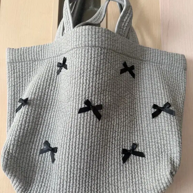 미사용 새상품 그레이 바탕 누비백 블랙 리본이 귀여운 빅 사이즈 백
