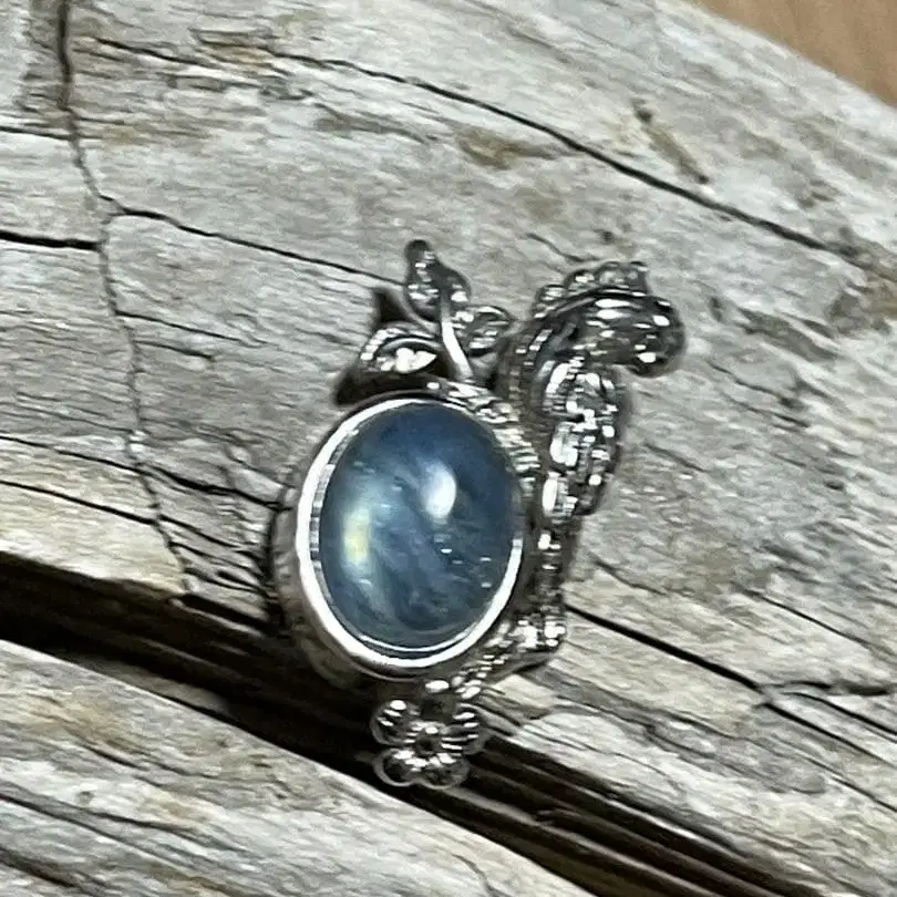 돌은 스카이블루 계열의 카보숑으로, 약간의 천연 내포물? 줄이 있습니다. 돌 소재는 불명입니다.