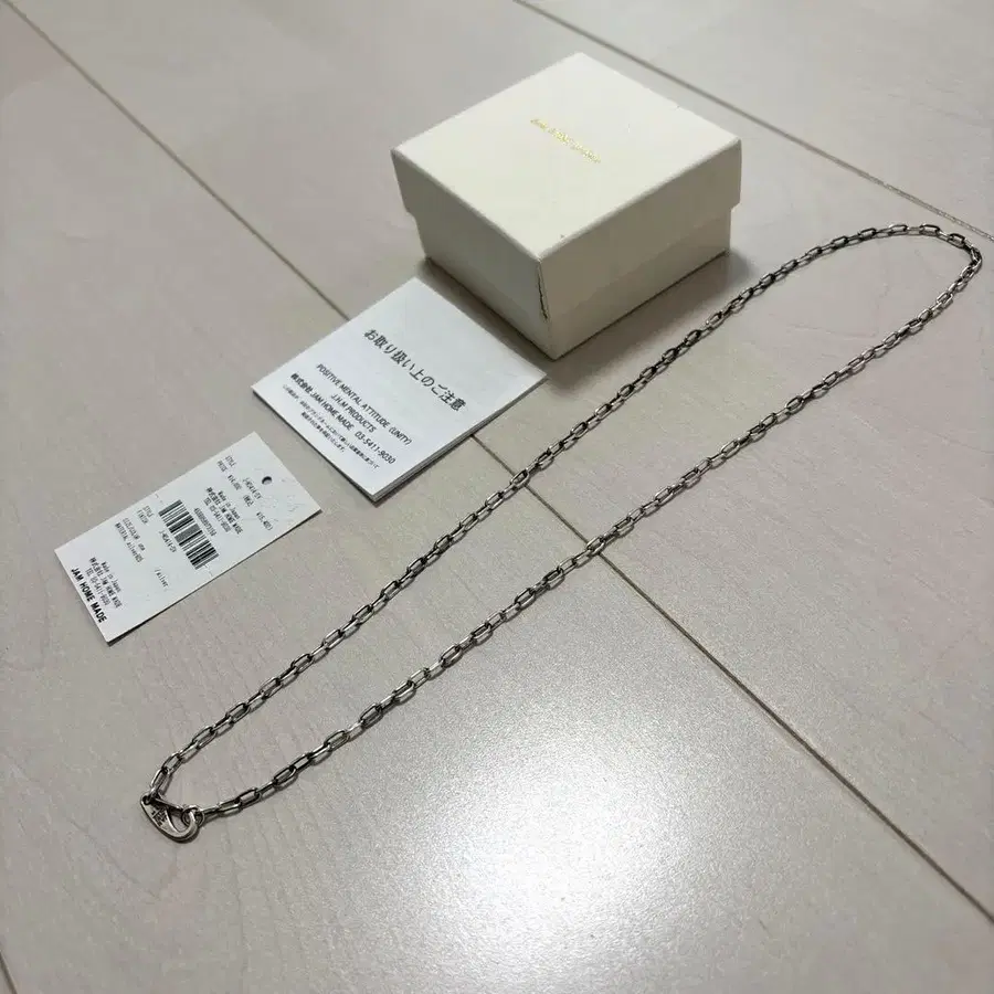 JAM HOME MADE의 마가타마 심플 체인 목걸이 & 팔찌 - 실버입니다. 소재는 silver 925입니다. 목걸이로 착용하는 것뿐만 아니라 손목에 감아 팔찌로도 착용 가능하여 패션이나 용도에 맞춰 사용할 수 있는 편리한 액세서리입니다. 개인 측정으로, 체인 길이 약 52cm, 체인 부품 폭 3mm, 후크 직경 1.5cm입니다. 구매 후 비흡연, 반려동물 없는 환경의 자택에서 한 번 시착한 후 상자에 넣어 어두운 곳에 보관했지만, 다른 마음에 드는 목걸이를 평소 착용하고 있어 이 상품은 앞으로 착용할 기회가 없을 것 같아 양도합니다. 구매 시 부속된 오리지널 박스, 택 모두 갖추어져 있어 함께 보내드립니다. 이하는 JAM HOME MADE의 상품 설명입니다. 브랜드 창립 초기부터 모티브로 사용해 온 구옥 모양의 오리지널 후크를 사용한 목걸이입니다. 사용하기 편리한, 매우 심플한 목걸이로, 잠금 위치를 바꿈으로써 자유롭게 사이즈 조절이 가능하며, 팔찌로도 착용 가능합니다. 이부시 가공을 더해 음영을 연출했습니다. 질리지 않는 심플한 디자인으로, 남성용, 여성용 모두 사용 가능하며, 선물로도 추천하며, 페어 아이템으로 인기가 많습니다.