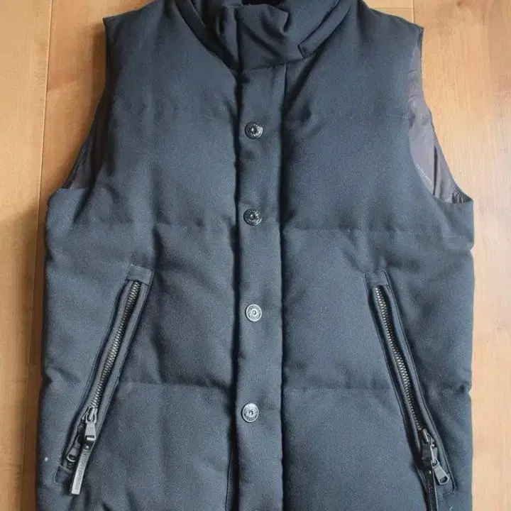 자동 번역되었어요. 원문보기심플한 디자인의 네이비 다운 베스트, 사이드 지퍼와 로고가 새겨진 버튼 포함.