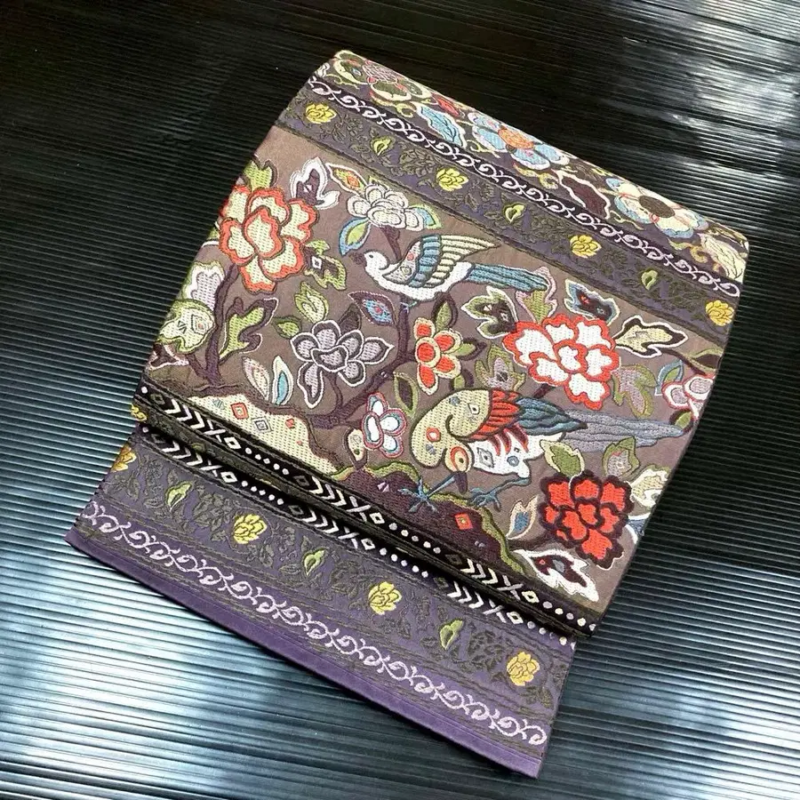 순수 실크 육통 후쿠로 오비 [ 꽃 새 보라색 ]