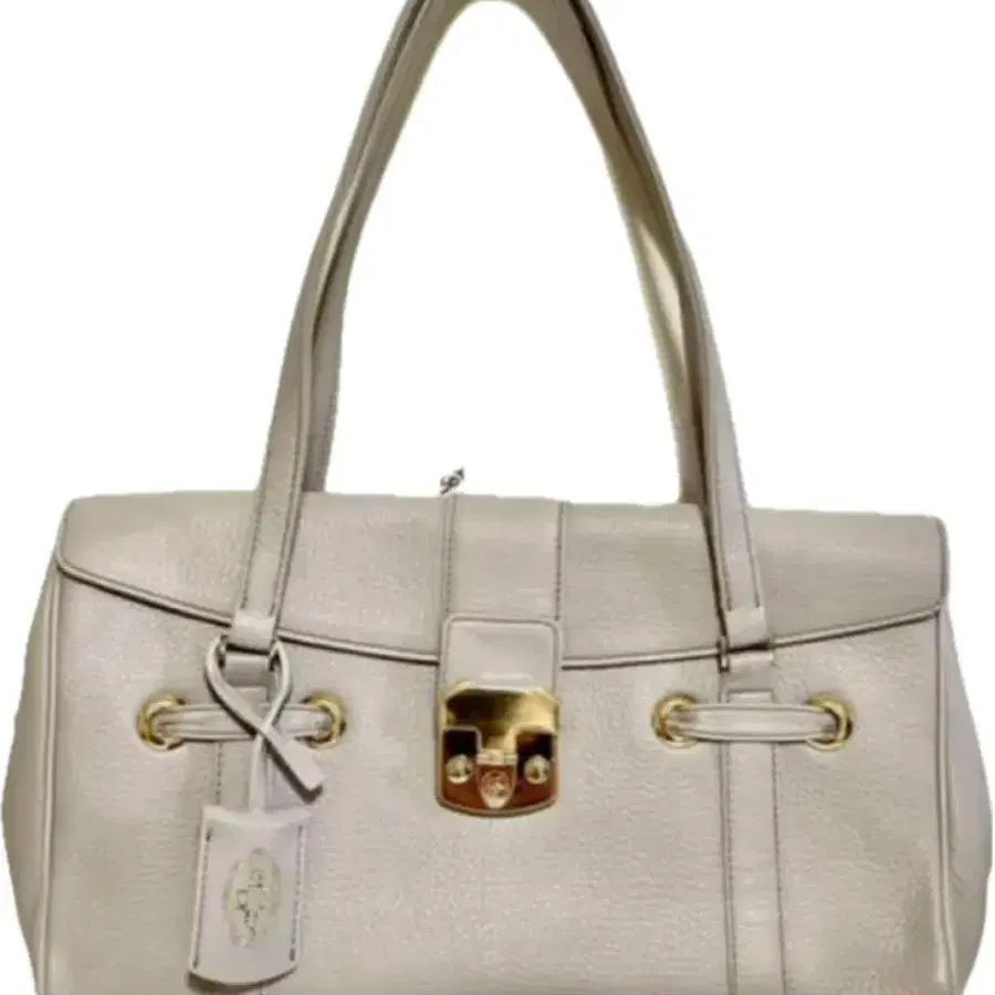 가로로 긴 실루엣과 엣지가 돋보이는 금장 장식이 인상적인 숄더백.
