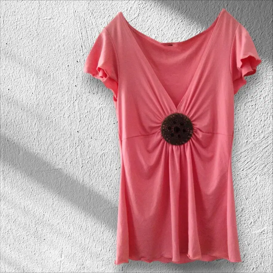 자동 번역되었어요. 원문보기V넥과 플레어 소매 디자인이 특징인 핑크색 T셔츠. 장식적인 버튼이 악센트.
