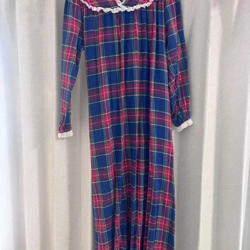 체크 무늬 롱 원피스 프릴 옷깃 긴팔 레트로 빈티지풍