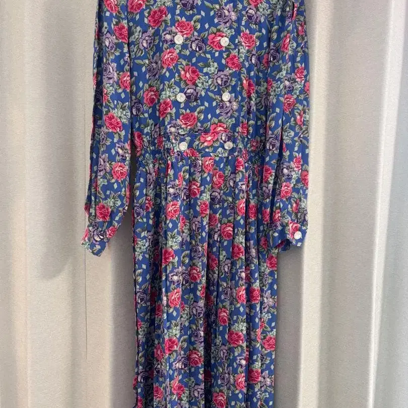 레트로 꽃무늬 롱 원피스 더블 버튼 블루 올 패턴 쇼와 레트로