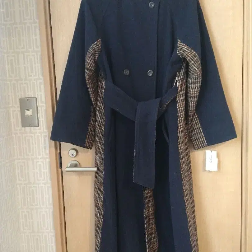 POU DOU DOU 네이비 체크 롱 코트 새상품 노카라 코트