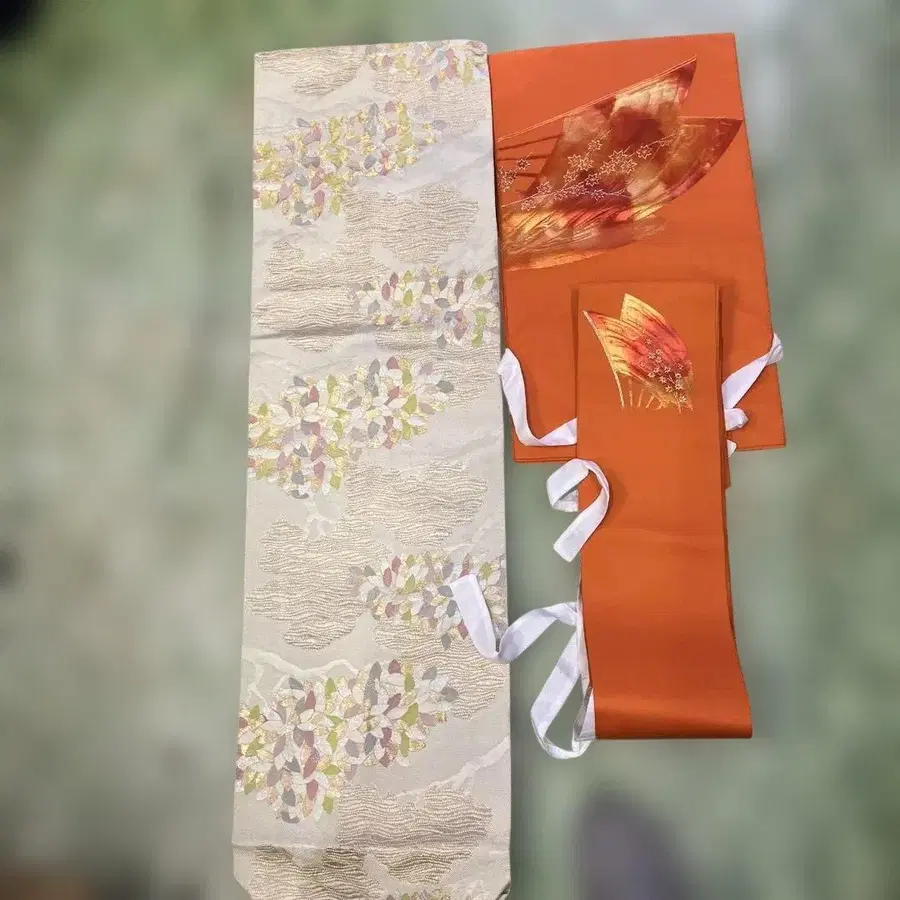 오렌지 컬러 후쿠로 오비 잎 무늬 금실 자수 2개
