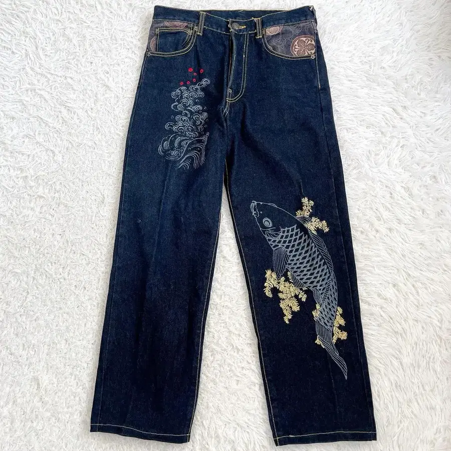 호텐 상점 데님 팬츠 배기 팬츠 일본풍 패턴 인디고 천, 잉어 자수
