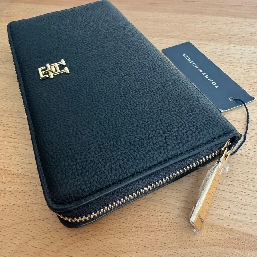 타미힐피거의 상징적인 TH 로고를 골드 금장 장식으로 장식한, 고급스러운 라운드 지퍼 장지갑입니다.