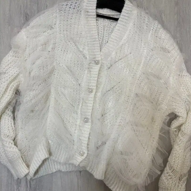 새상품 이번 시즌 모 브랜드 샘플 튤 셔링 니트 가디건 화이트