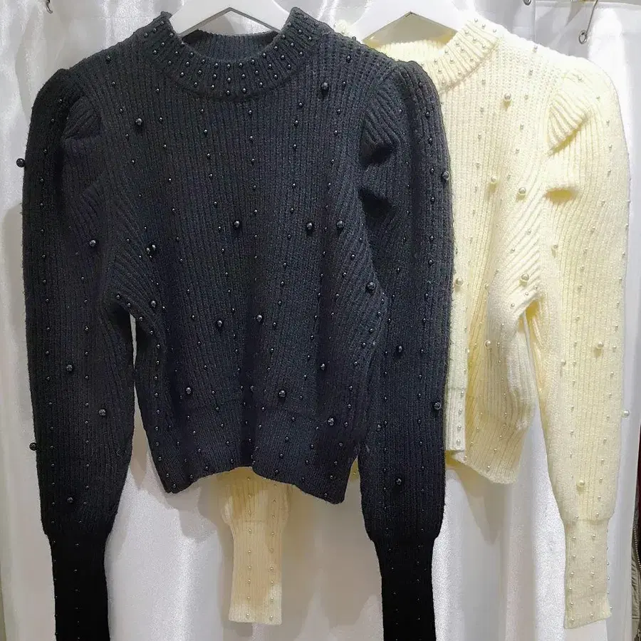 펄 장식이 달린 퍼프 슬리브 리브 니트