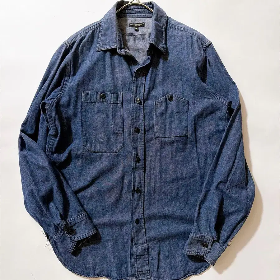 Engineered Garments 엔지니어드 가먼츠 워크 셔츠 샴브레이 데님 인디고 고양이 눈 버튼 밴드 포함 바닥 포함 엘보 배치 빈티지 가공 데미지 가공 USA제 미국제 남성용 M 네펜데스
