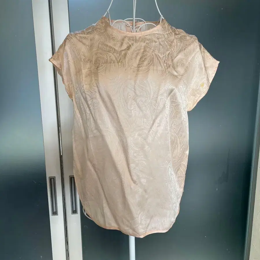 자동 번역되었어요. 원문보기엠보싱 가공의 베이지 반팔 상의, 백에 버튼 포함.