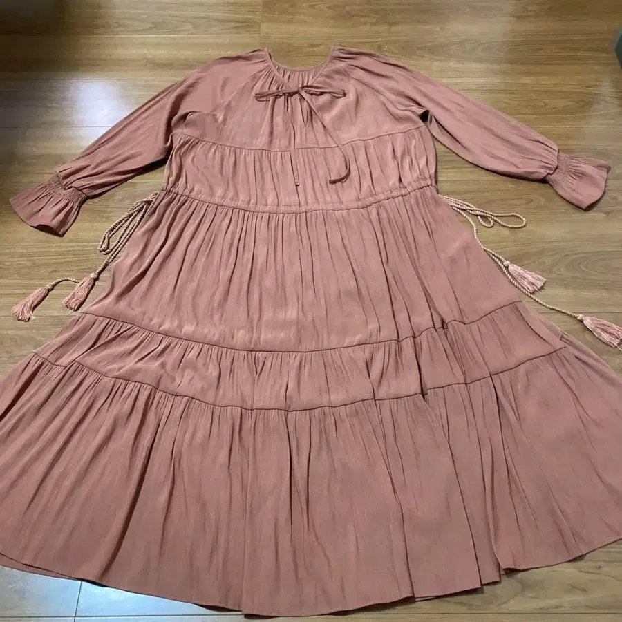 핑크 리본 포함 티어드 롱 원피스
