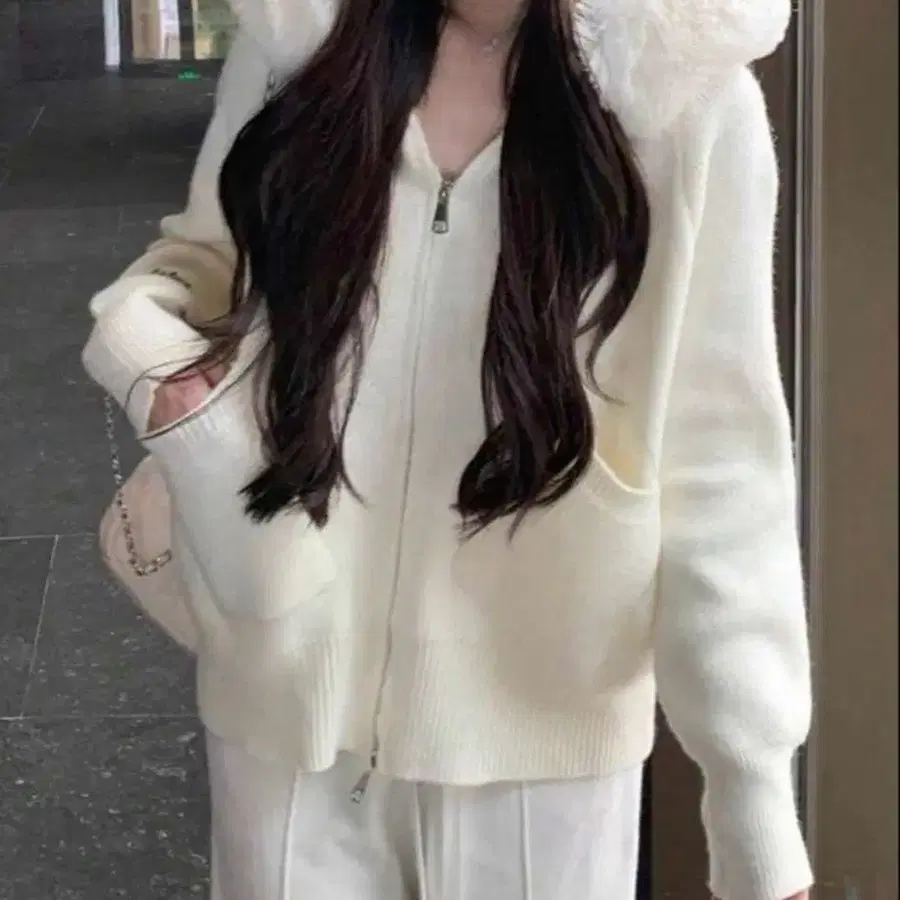 화이트 퍼 카라 부착 여성용 후드 부착 가디건 | 프론트 지퍼 개폐