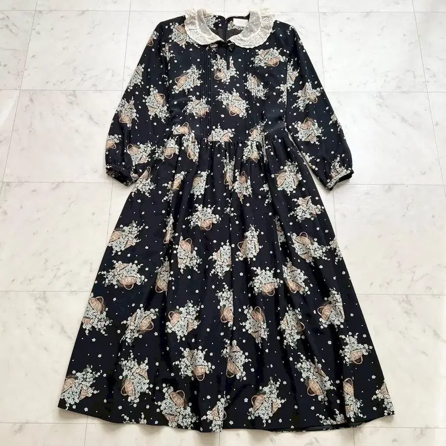 전원시 레이스 옷깃 플라워 프린트 원피스 롱 바스켓