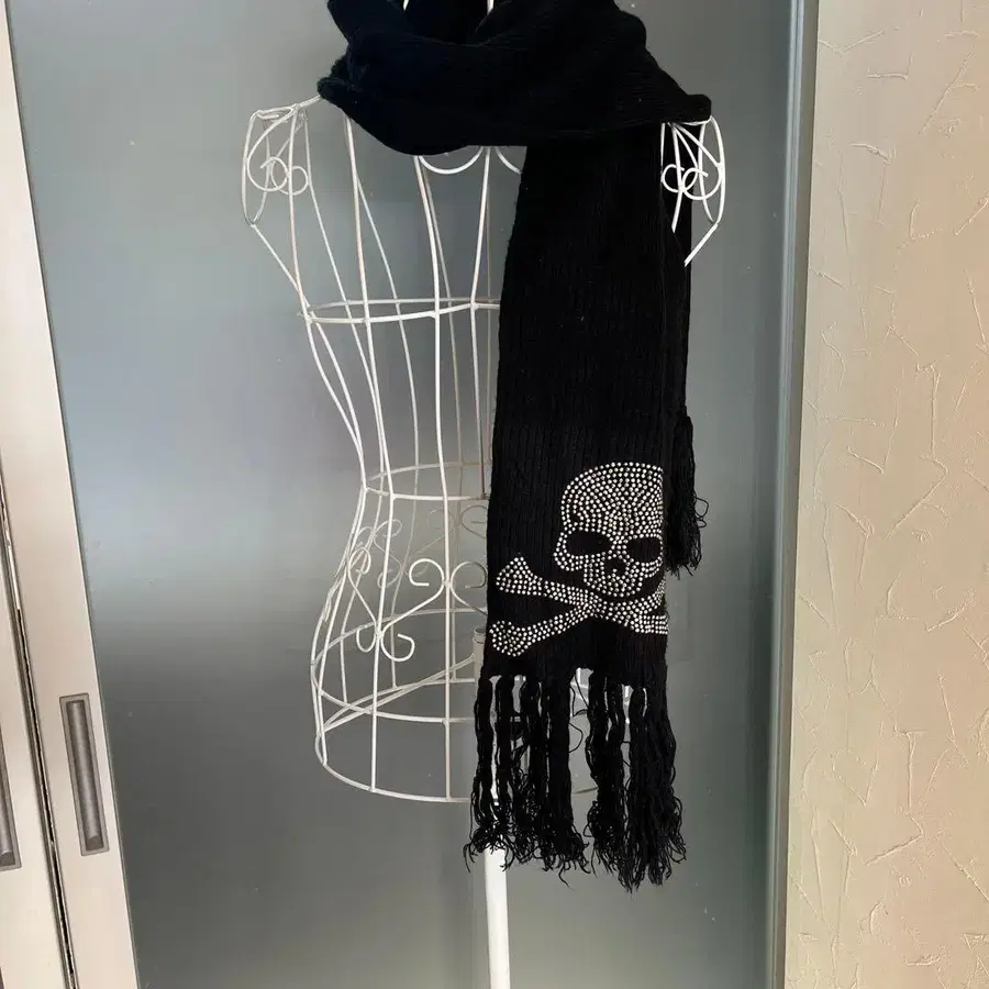 대형 큐빅으로 장식된 스컬(해골)과 크로스본 디자인이 임팩트 있는 머플러입니다.