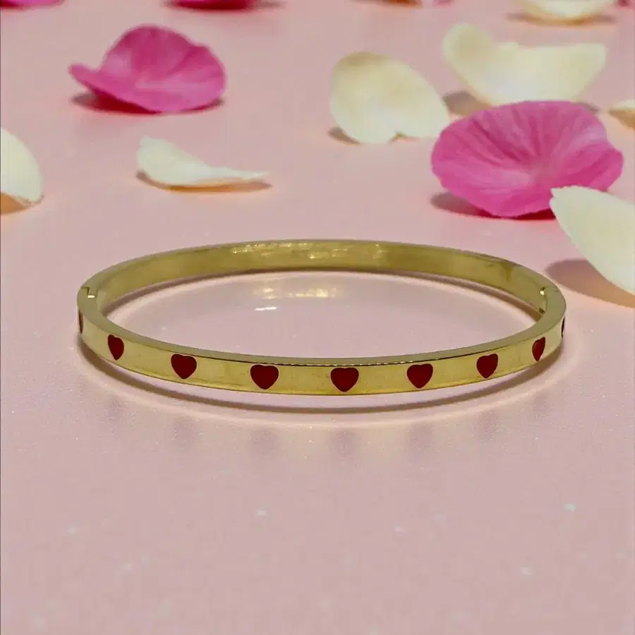 My Jewellery 2011년 네덜란드에서 설립. 주얼리를 메인으로, 오리지널 어패럴, 잡화 등도 판매. 독일, 벨기에, 프랑스에 부티크를 전개하고 있습니다. --------------------- 심플함 속에 귀여움을 담은 골드 컬러의 뱅글 팔찌. 슬림하고 세련된 형태의 표면에는 빨간색 하트 모티브가 빙 둘러져 있어 귀여움과 고급스러움이 절묘하게 조화된 디자인입니다. 광택 있는 골드의 빛깔은 손을 밝게 보이게 하며, 어떤 코디에도 어울리는 다용도 아이템. 하나만 착용해도 페미닌하고 위트 있는 악센트를 더합니다. 클로징이 눈에 띄지 않는 슬림한 설계로 착용감도 가볍습니다. 데일리 포인트로도 기프트로도 추천하는 팔찌입니다. ※ 전체 3종 컬러 이미지를 참고로 게재했습니다. ※ 금액 부분은 삭제되었습니다. --------------------- [ 사이즈 ] 안지름: 약 6cm 두께: 약 0.3cm 입구: 약 7cm ※ 수작업으로 측정했기 때문에 약간의 오차가 있을 수 있습니다. --------------------- 소재: 프리미엄 스테인리스 스틸