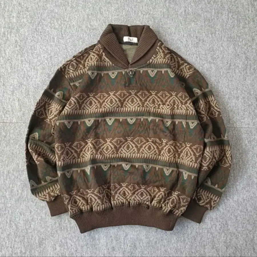 브라운을 기조로 그린과 베이지를 조합한 민족풍 (에스닉풍) 패턴이 전체적으로 들어가 독특한 분위기를 자아내는 디자인 상의입니다.