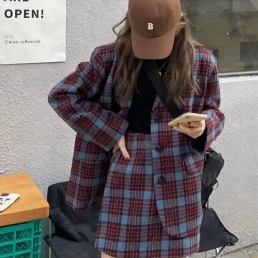 체크 무늬 테일러드 자켓 + 스커트 셋업