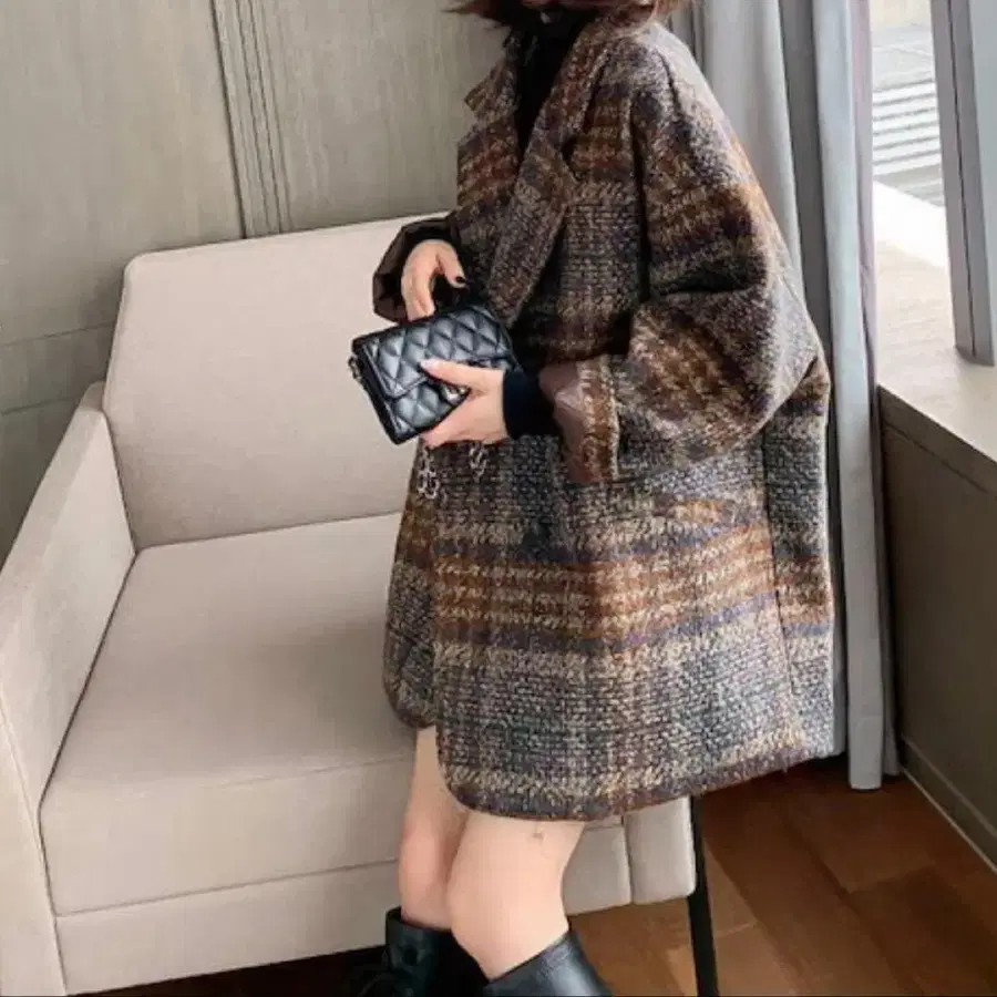 체크 오버사이즈 미들 기장 코트